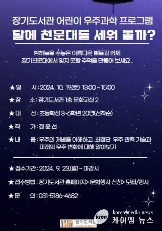(케이엠뉴스) 김포시 장기도서관은 10월 19일 오후 1시에 초등학생 3~6학년을 대상으로 '달에 천문대를 세워 볼까?'를 운영한다.