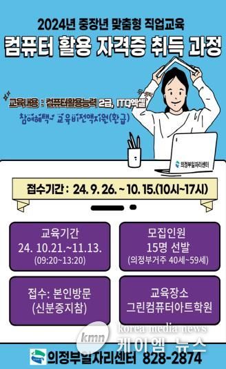 (케이엠뉴스) 의정부시는 중장년 구직자를 위한 맞춤형 직업교육 프로그램인 ‘컴퓨터 활용 자격증 취득 과정’ 참여자를 모집한다.