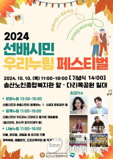 또한 송산노인종합복지관은 10월 10일 복지관 앞 다리목공원에서 ‘선배시민 우리누림 페스티벌’을 개최, 선배시민이 주도하는 문화공연과 바자회 행사, 건강 운동(캠페인) 등 세대 간 문화교류를 추진한다.