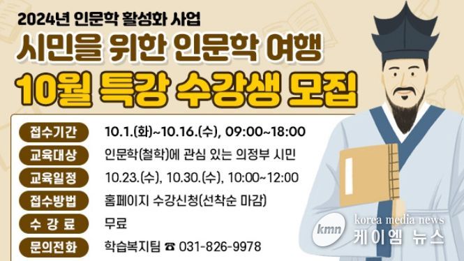 (케이엠뉴스) 재단법인 의정부시평생학습원은 10월 23일과 30일 의정부문화역 이음에서 ‘2024년 시민을 위한 인문학 여행, 10월 철학 강좌’를 운영한다.