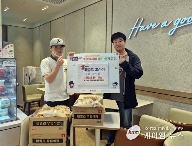 (케이엠뉴스) 의정부시 송산1동주민센터는 10월 23일 뚜레쥬르 의정부 고산점이 ‘100일간 사랑릴레이 배턴 잇기’에 참여해 저소득 가구에 빵을 전달했다고 밝혔다.