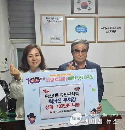 (케이엠뉴스) 의정부시 송산1동주민센터는 11월 1일 송산1동 주민자치회 최남진 부회장이 ‘100일간 사랑릴레이 배턴 잇기’에 동참해 성금을 전달하며 따뜻한 선행을 이어갔다고 밝혔다.