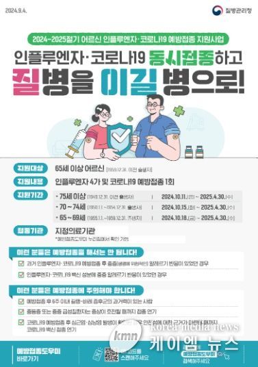 만 65세 이상 미접종자는 주소지 관계없이 2025년 4월 30일까지 전국 위탁 의료기관에서 인플루엔자 및 코로나19 동시 접종이 가능하며, 만 60~64세 취약계층 인플루엔자 무료 접종 대상자는 주소지 관할 보건소를 방문해야 접종할 수 있다.