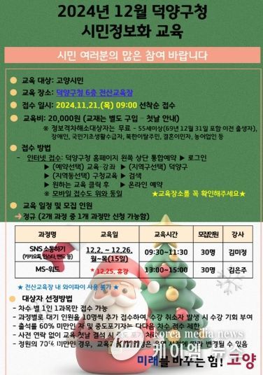 (케이엠뉴스) 고양특례시 덕양구는 고양시민을 대상으로 하는 제9차 시민정보화교육 접수가 오는 21일 오전 9시부터 진행된다고 밝혔다.