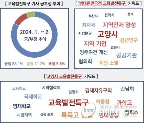 고양시가 올해 초 교육부가 추진하는 교육발전특구 시범지역으로 선정되며 관련 보도도 꾸준히 증가하고 있다. SNS 여론에서 고양시 양육 및 교육 환경 관심도 분석 결과 ‘교육발전특구’ 관련 보도에 긍정적 반응이 80% 이상을 차지하며 고양시 교육발전에 대한 시민들의 기대감이 높은 것으로 나타났다.