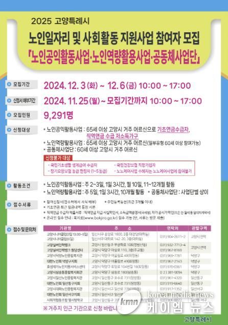 오는 25일부터 고양시 노인일자리 수행기관 11개소에서 신청서를 배부할 계획이며, 12월 3일부터 16일까지 방문 신청 또는 복지로를 통한 온라인 신청이 가능하다.