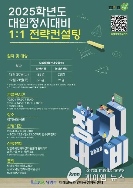 (케이엠뉴스) 남양주시는 오는 21일부터 내달 8일까지 ‘2025학년도 대입정시 대비 1:1 전략컨설팅’참여자를 모집한다고 밝혔다.