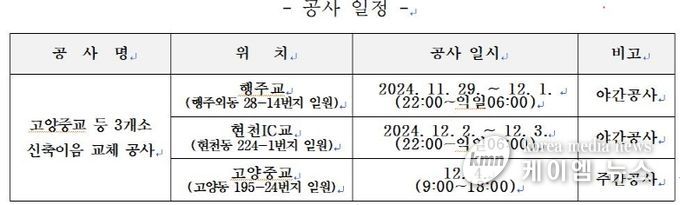 (케이엠뉴스) 고양특례시는 지난 20일부터 ‘고양중교’등 3개소의 교량 신축이음 교체 공사를 실시해 내년 1월 3일까지 완료한다고 밝혔다.