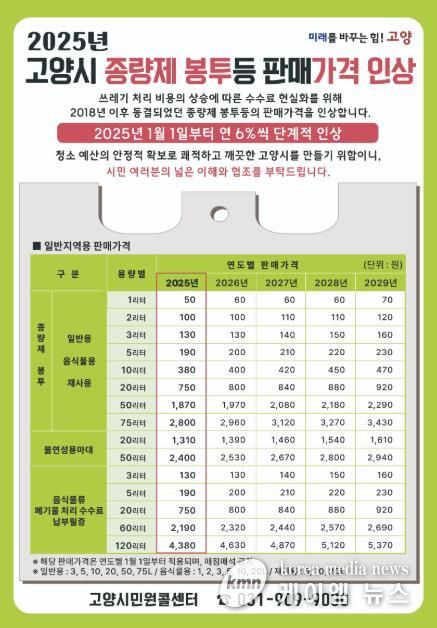 (케이엠뉴스) 고양특례시가 2025년 1월 1일부터 종량제 봉투등의 판매가격을 인상한다.