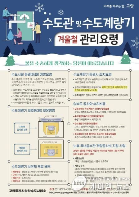 고양시는 겨울철 한파 대비 상수도 종합대책을 수립해 추진한다. 수도계량기 동파를 막기 위해 취약 가정을 대상으로 보온재를 무료로 배부하고, ‘겨울철 수도관 및 수도계량기 관리 요령’ 홍보물을 배포해 보온 방법과 동파 시 조치 요령 등을 적극 알리고 있다.