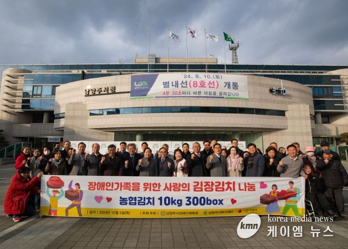 (케이엠뉴스) 남양주시장애인체육회는 5일 시청광장에서 후원자와 남양주복지재단, 장애인단체와 시설 관계자 등 30여 명이 참석한 가운데 장애인 가족들을 위한 ‘사랑의 김장 김치 전달식’을 진행했다.