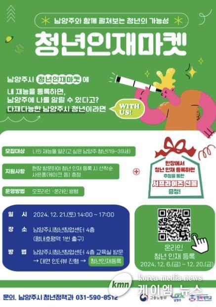 (케이엠뉴스) 남양주시는 다양한 분야의 숨겨진 청년 인재를 발굴하기 위해 ‘청년인재마켓’ 참여자를 6일부터 21일까지 모집한다.