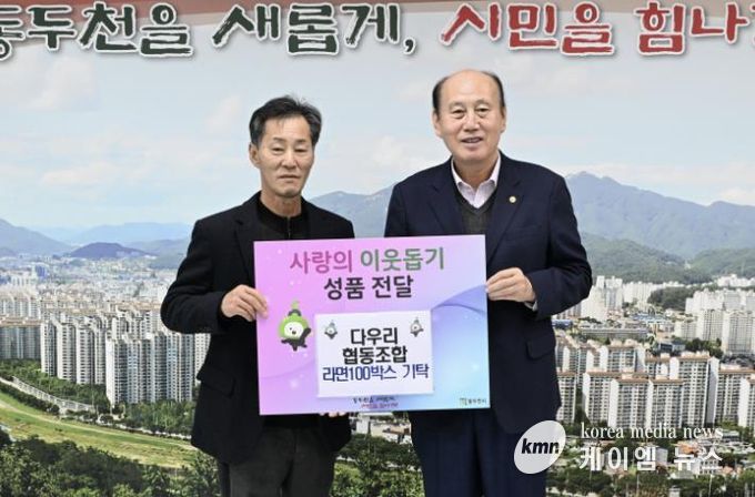 (케이엠뉴스) 다우리협동조합은 9일, 동절기 소외된 이웃들에게 따뜻한 온정을 나누기 위해 동두천시청에 라면 100박스를 기탁했다.