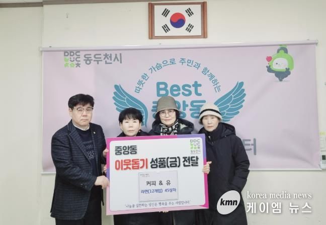 (케이엠뉴스) 중앙동 행정복지센터는 17일, 동두천 커피앤유로부터 이웃 돕기 성품으로 컵라면(12개입) 45상자를 전달받았다고 밝혔다.