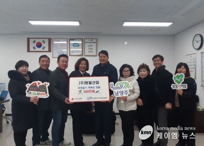 (케이엠뉴스) 남양주시 수동면 소재 ㈜원일산업은 18일 지역 내 어려운 이웃을 위한 후원금 500만원을 경기사회복지공동모금회를 통해 수동면 지역사회보장협의체에 지정 기탁했다.