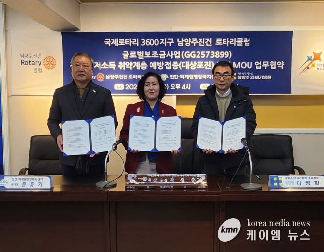 (케이엠뉴스) 남양주시 진건퇴계원행정복지센터는 지난 16일 남양주진건로타리클럽 및 남양주21세기병원과 함께 진건읍 저소득층 대상포진 예방접종 지원을 위한 삼자 업무협약을 체결했다.