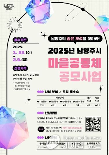 (케이엠뉴스) 남양주시는 주민의 자발적 참여와 소통을 통해 지역문제를 해결하고 마을공동체를 활성화하기 위한 ‘2025년 마을공동체 공모사업’을 1월 22일부터 2월 9일까지 접수한다.