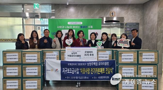 (케이엠뉴스) 국제로타리 3600지구 남양주 백합로타리클럽은 지난 17일 지역 내 어려운 이웃을 위한 200만 원 상당의 온열매트 36개를 수동면사무소에 전달했다.