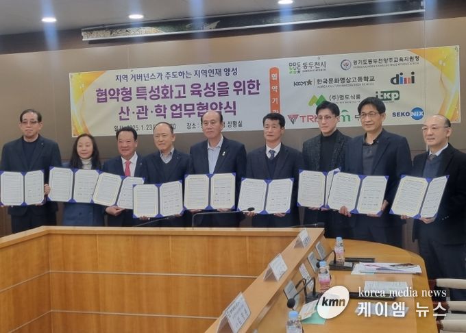 (케이엠뉴스) 동두천양주교육지원청은 1월 23일, 동두천시청 상황실에서 동두천양주교육지원청, 동두천시청, 한국문화영상고 및 지역내 7개 기업체가 함께하는 산관학 업무협약식을 개최했다. 이번 협약은 동두천시 협약형 특성화고 지정 지원 및 직업교육 혁신지구 공모를 대비해 지역 기반 직업교육 플랫폼을 구축하기 위해 마련됐다.