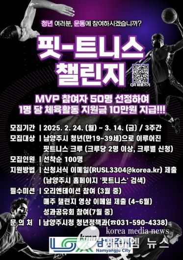 (케이엠뉴스) 남양주시는 2월 24일부터 3월 14일까지 3주간, ‘청년 핏트니스 챌린지’ 참여자를 공개 모집한다고 21일 밝혔다