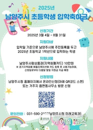 (케이엠뉴스) 남양주시는 2025년 초등학교에 입학하는 아동을 대상으로 입학축하금 신청을 접수한다고 4일 밝혔다.