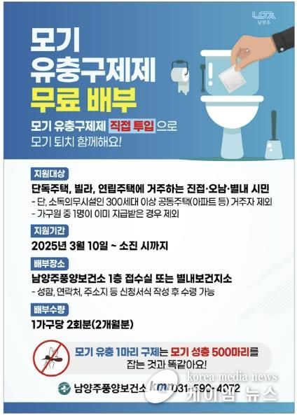 (케이엠뉴스) 남양주풍양보건소는 말라리아와 일본뇌염 등 감염병을 매개하는 모기의 개체수를 줄이기 위해 유충구제제를 무료로 배부하는 유충구제 사업을 10일부터 본격 추진한다.