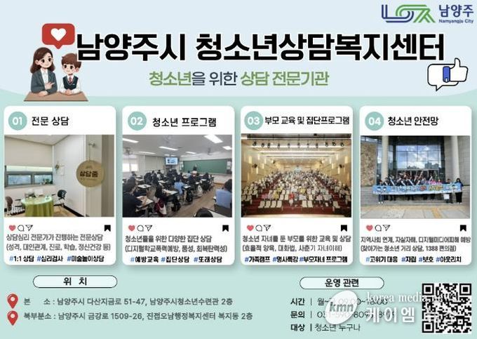 (케이엠뉴스) 남양주시는 9세부터 24세까지의 청소년들이 건강하고 안정적으로 성장할 수 있도록 청소년상담복지센터의 기능을 더욱 강화한다고 11일 밝혔다.