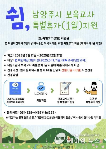 관내 동일 어린이집에서 3년 이상 재직(2025년 3월 17일 기준)한 담임교사는 어린이집 원장의 승인을 받아 남양주시육아종합지원센터 누리집에서 특별휴가를 신청할 수 있으며, 별도로 신청서 등 관련 서류를 추가로 제출해야 한다.