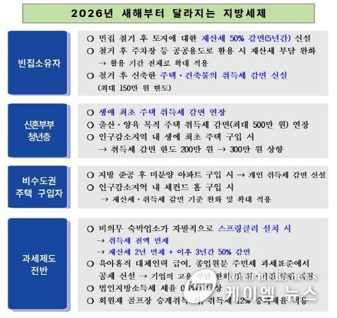 이번 개정은 △빈집 정비 △출산·양육 주택 취득 지원 △지역 균형발전 △공정 과세체계 구축에 중점을 두고 추진됐다.