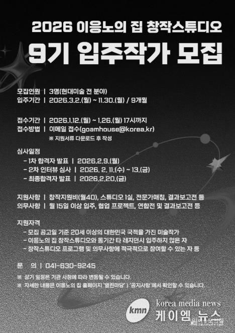 이번 9기 입주작가는 총 3명을 선발하며, 장르 제한 없이 현대미술 전 분야의 작가가 지원할 수 있다. 선정된 작가들은 오는 3월부터 11월까지 약 9개월간 이응노의 집 창작스튜디오에 입주해 창작 및 거주 공간을 지원받는다. 이와 함께 월 40만 원의 창작지원비, 전문가 매칭 프로그램, 레지던시 연합전 참여, 결과보고전 개최 등 다양한 창작 지원 프로그램이 제공된다.