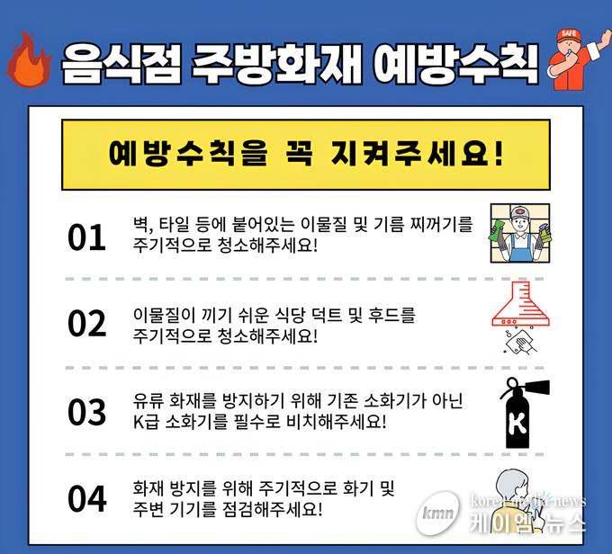 겨울철 음식점 화재를 예방하기 위해 ▲주방 내 가스레인지 주변에 소화기와 K급 소화기를 비치 ▲동‧식물 기름을 제거할 수 있는 필터 등 설치 ▲자동확산소화장치 및 가스차단기를 설치 ▲노후된 전선 교체 등 안전수칙을 준수하여야 한다.