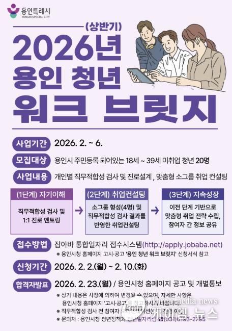 (케이엠뉴스) 용인특례시는 2월 2일부터 10일까지 상반기 청년 맞춤형 진로 설계 프로그램 참가자를 20명을 모집한다고 27일 밝혔다.