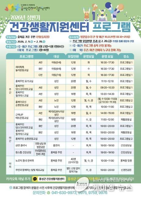 (케이엠뉴스) 홍성군 건강생활지원센터는 홍북읍 주민의 체력 증진과 건강한 생활습관 형성을 위해 2026년 신체활동 프로그램을 총 3기로 운영할 예정이며, 내달 9일부터 19일까지 1기 참여자를 모집한다.