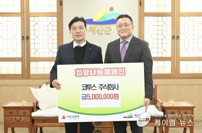 (케이엠뉴스) 예산군은 예당호 모노레일 운영회사인 주식회사 코투스가 어려운 이웃을 돕기 위한 ‘희망 2026 나눔캠페인’에 동참해 성금 500만 원을 기탁했다고 2일 밝혔다.