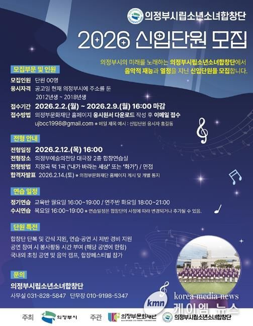 전형은 2월 12일 의정부예술의전당 2층 연습실에서 실시되며, 응시자는 지정곡인 ‘내가 바라는 세상’과 ‘화가’ 중 1곡을 선택해 가창하면 된다. 최종 합격자는 2월 14일 의정부문화재단 누리집과 개별 통지를 통해 발표할 예정이다.