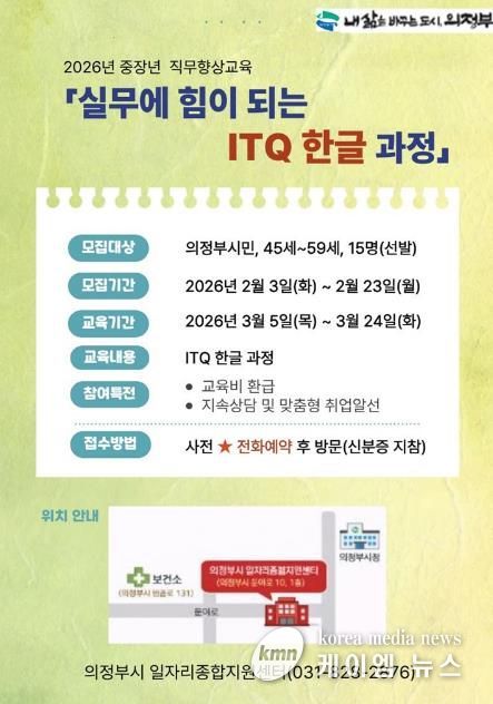 (케이엠뉴스) 의정부시는 2026년 중장년 직무향상교육의 일환으로 ‘실무에 힘이 되는 ITQ 한글 과정’ 참여자를 모집한다.