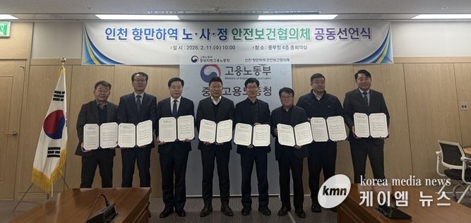 (케이엠뉴스) 중부지방고용노동청은 2월 11일 인천 항만하역 현장의 산업재해 예방과 안전문화 정착을 위해 노동자·사업주·정부가 함께하는 ‘인천 항만하역 노·사·정 안전보건협의체 공동선언식’을 개최했다.
