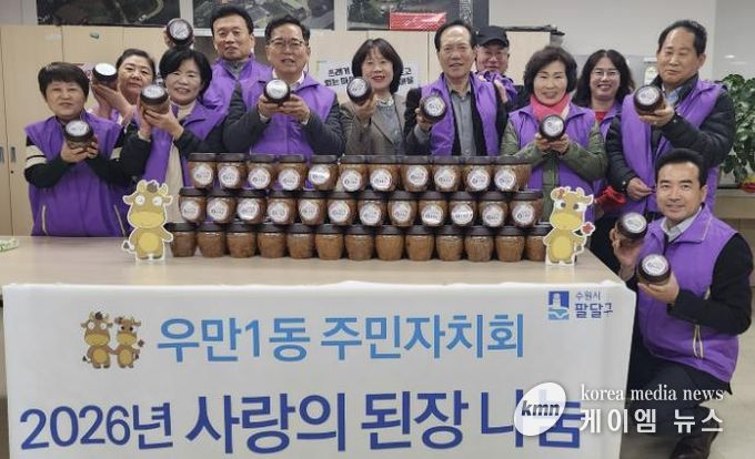 (케이엠뉴스) 수원시 팔달구 우만1동 주민자치회는 지난 9일, 우만1동 행정복지센터에서 지난해 전통 방식으로 담가 숙성한 된장을 관내 취약계층에게 전달하는 ‘사랑의 된장 나눔 행사’를 진행했다.