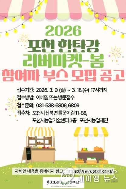 (케이엠뉴스) 포천시농업재단은 오는 5월 한탄강 생태경관단지에서 열리는 ‘2026년 포천 한탄강 리버마켓-봄’ 행사에 참여할 부스 운영자를 공개 모집한다.