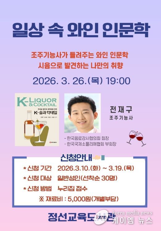 (케이엠뉴스) 정선교육도서관은 오는 3월 26일 일반성인을 대상으로 제1차 퇴근길 인문학 “ '일상 속 와인 인문학' : 알고 마시면 달라지는 와인”을 운영한다.