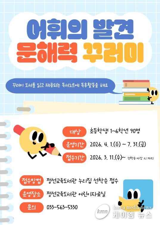 (케이엠뉴스) 정선교육도서관은 초등학생의 기초 언어 능력과 읽기 역량 강화를 위해 4월 1일부터 7월 31일까지 어린이자료실에서는 어휘의 발견 ‘문해력 꾸러미’를 운영하며, 학교 연계로는 달려라! ‘문해력 북꾸러미’를 운영한다.