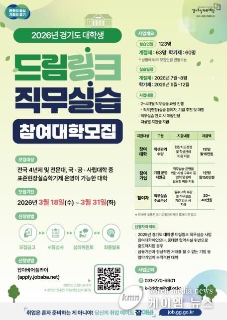 (케이엠뉴스) 경기도와 경기도일자리재단이 ‘경기도 대학생 드림링크 직무실습’ 사업에 참여할 15개 협력대학을 31일까지 모집한다.
