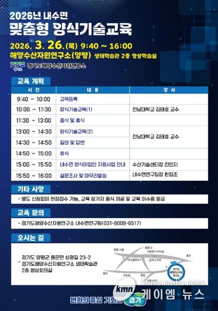 (케이엠뉴스) 경기도해양자원연구소는 오는 26일 양평에 있는 연구소 생태학습관에서 내수면 양식 어업인의 역량 강화를 위한 양식기술교육을 실시한다.
