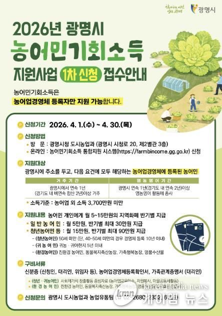 (케이엠뉴스) 광명시는 오는 4월 1일부터 4월 30일까지 ‘농어민 기회소득 지원사업 1차’ 신청을 받는다.