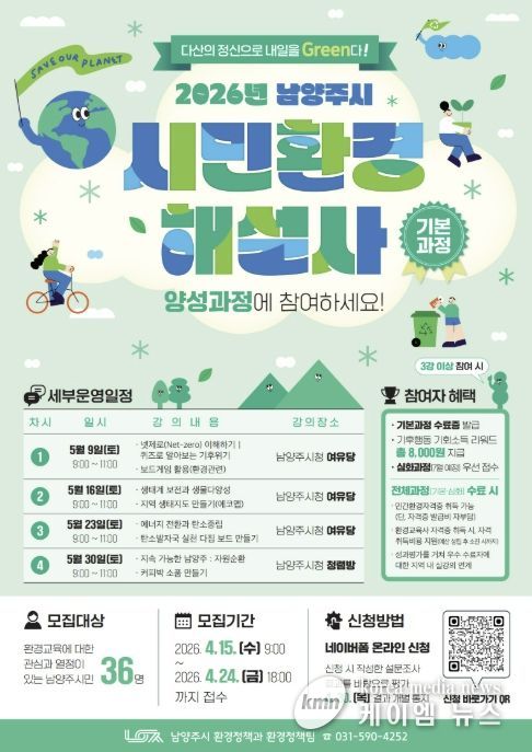 (케이엠뉴스) 남양주시는 오는 24일까지 시민이 직접 기후위기와 생태환경을 배우고 이를 지역사회와 나누는 ‘2026년 남양주시 시민환경해설사 기본과정’ 참여자를 모집한다고 15일 밝혔다.