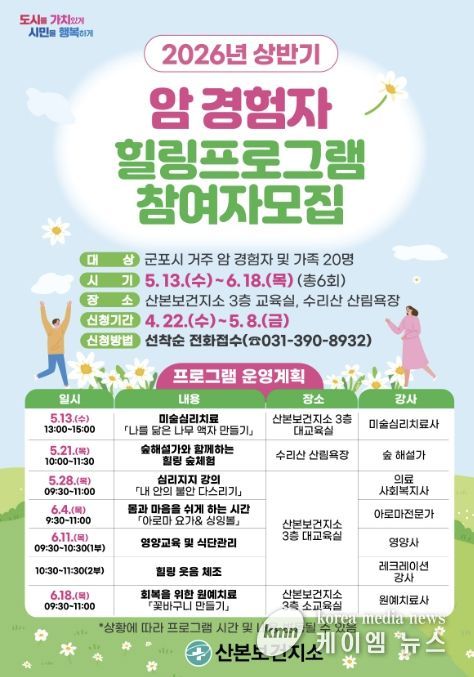 (케이엠뉴스) 군포시 산본보건지소는 오는 5월 13일부터 6월 18일까지 총 6회에 걸쳐 암 경험자와 그 가족 20여 명을 대상으로 암 경험자 자조모임인 ‘봄·봄·봄 프로그램’을 운영한다.