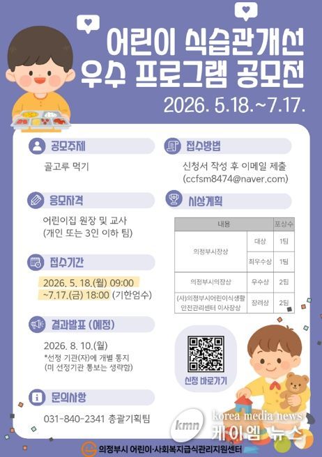 (케이엠뉴스) 의정부시가 운영하는 의정부시 어린이‧사회복지급식관리지원센터는 어린이 보육시설을 대상으로 5월 18일부터 7월 17일까지 ‘어린이 식습관 개선 우수 프로그램 공모전’을 개최한다.