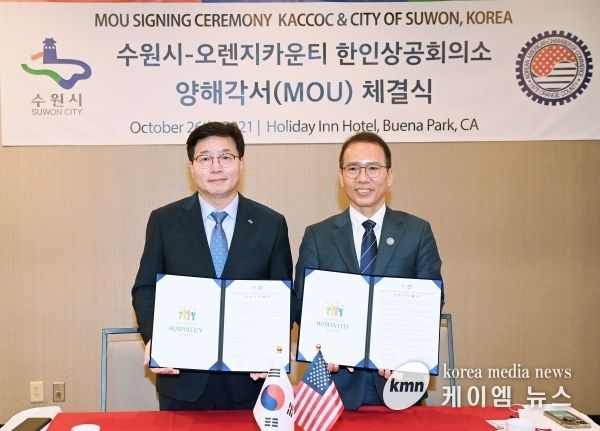 염태영 수원시장은 26일 오후 오렌지카운티 홀리데이인 부에나파크에서 노상일 KACCOC 회장과 협약을 체결하고 수원시와 KACCOC 간 협력·교류를 약속했다.