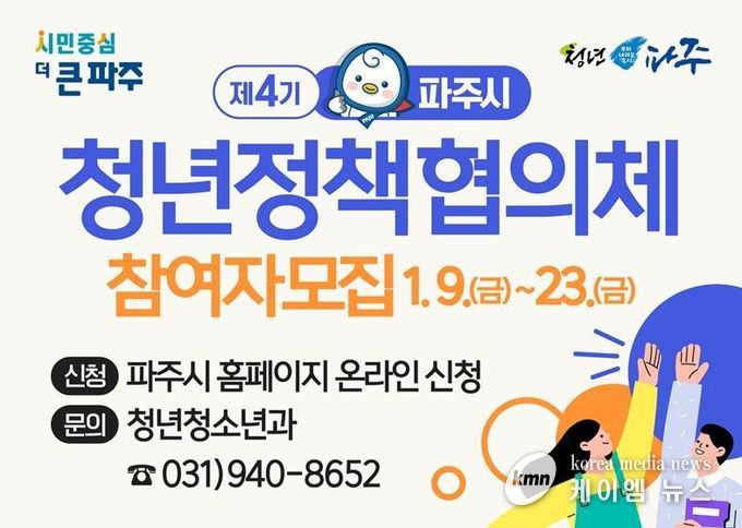 (케이엠뉴스) 파주시는 청년이 정책의 수혜자를 넘어 직접 참여하는 정책 주체로 성장할 수 있도록, ‘제4기 파주시 청년정책협의체’참여자를 오는 23일까지 모집한다.