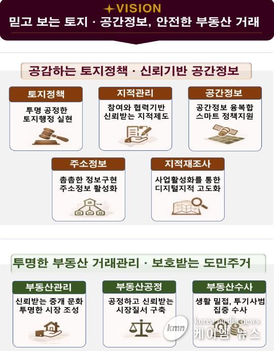 추진계획은 ▲투명하고 균형 잡힌 제도 운영으로 신뢰받는 토지행정 실현 ▲참여와 협력을 통한 신뢰받는 지적제도 정착 ▲공간정보 융·복합을 통한 스마트한 정책 지원 ▲촘촘한 주소정보 구현 및 주소정보 활성화 추진 ▲사업활성화를 통한 디지털지적 고도화 ▲신뢰받는 중개 문화와 투명한 부동산 시장 조성 ▲공정하고 신뢰받는 시장질서 구축 ▲생활밀접, 투기사범 집중수사 등 8대 전략을 바탕으로 한 92개 세부 이행과제로 구성됐다.